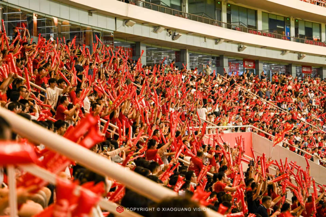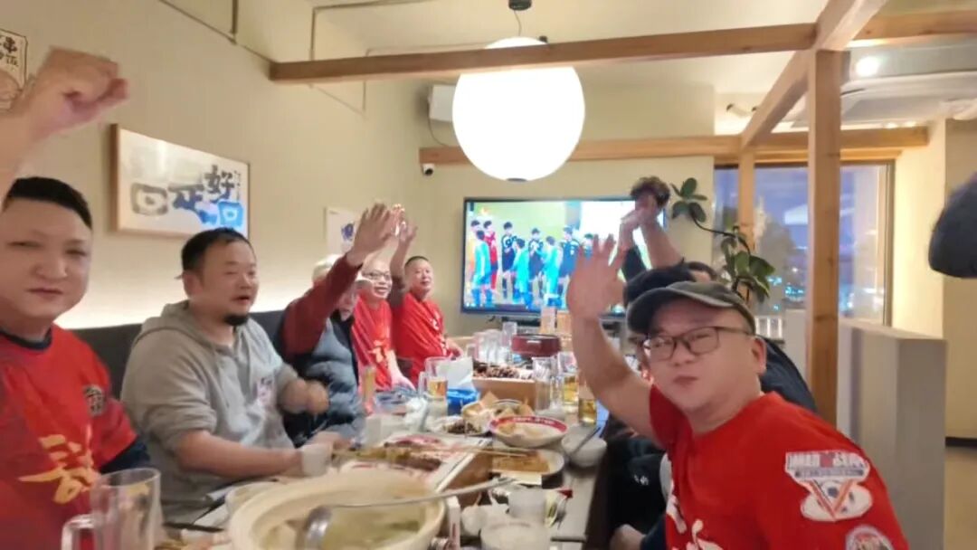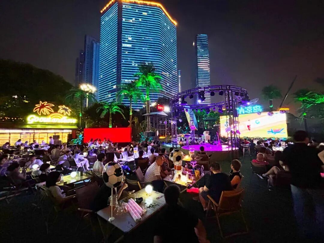 在野肆月球,巨型LED屏矗立草坪中央,数百名球迷围坐于露营椅上观看球赛直播。