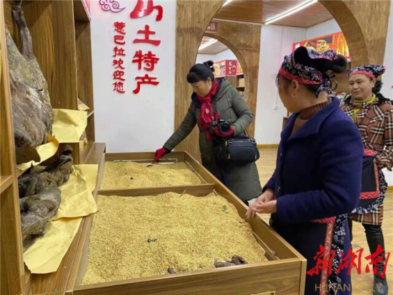 为了加强旅游扶贫,让村民们更好地享受到旅游开发带来的实惠,村里成立了惹巴拉扶贫超市,销售当地农特产品。超市里摆满了腊肉、霉豆腐、土家织锦等琳琅满目的农特产品,令人爱不释手。村民向凤枝家庭困难,村里就聘请她到超市当售货员,每个月工资2000多元。