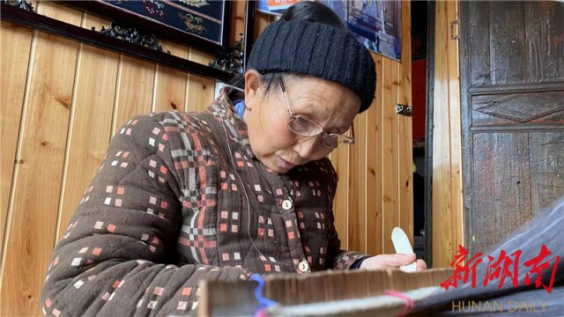捞车河村村民、65岁的国家非遗项目土家织锦传承人刘代娥,戴着老花镜,在家里织布机上挑织,神情专注。“土家织锦,土家语称‘西兰卡普’。土家族只有语言没有文字,我们通过织锦图案来记录历史,每块织锦都是一本书。” 刘代娥告诉记者,传统西兰卡普是反面挑花,她们新创了一种花色,即双面挑花。西兰卡普用色常借鉴艳丽的鲜花、鸳鸯的羽毛、天空的晚霞和雨后的彩虹,纹样以菱形、斜线条为主,讲究几何对称,传统纹样有上百种。