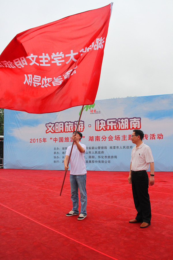 省政府副秘书长熊方平为首支“湖南省大学生文明旅游志愿者劝导队”授旗