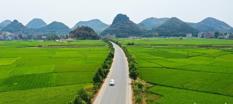 The photo taken on September 21 shows that in Xintian County, the well-grown late rice and the car speeding on the highway complement each other well.