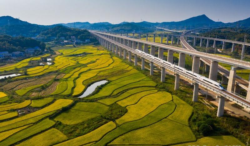 The photos taken on September 20 show a white train is speeding over the endless golden rice filed.
