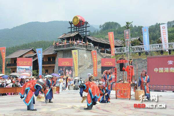 7月11日,来自韩国、甘肃、贵州和新化本土的6支傩戏代表队在新化大熊山国家森林公园蚩尤屋场“梅山九五大坛”进行了交流展演。该傩坛直径达39米,是当今世界第一大傩坛。展演会上,来自新化的傩戏《踩九州》《扎六娘》《土地送春牛》和《还都猖大愿》等经典梅山傩戏以其原生态的韵味赢得与会专家、学者的阵阵掌声,其丰富多彩的表演形式,粗犷夸张的动作,幽默诙谐的语言以及高亢亮丽又优美婉转的唱腔让大家真正体验到了自成体系的梅山傩戏的独特魅力。