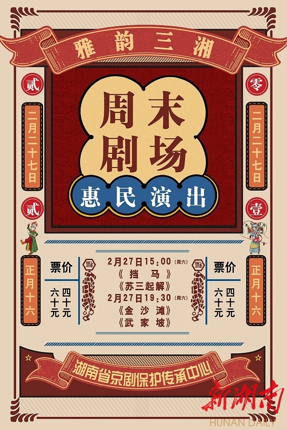 票友们,暂停一段时间的京剧剧场又要热闹起来啦!本周六(2月27日)开始,湖南省京剧保护传承中心的“雅韵三湘·周末剧场·惠民演出季”将正式开锣。2月底至4月中旬,每周在省京剧保护传承中心新剧场为戏迷们献上2场演出。