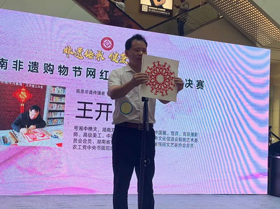 6月10日,在“文化和自然遗产日”2020年湖南主会场,举行了“湖南非遗购物节暨网红直播带货大赛”前十强颁奖仪式,双峰县剪纸艺术家王开健斩获十强。