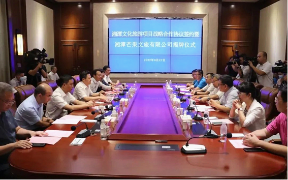 8月27日上午,湘潭文化旅游项目战略合作协议签约暨湘潭芒果文旅有限公司揭牌仪式在万楼景区举行。湘潭市委书记刘志仁,湖南广播影视集团(湖南广播电视台)党委副书记、总经理、台长、总编辑龚政文共同见证签约,为新成立的湘潭芒果文旅有限公司揭牌。