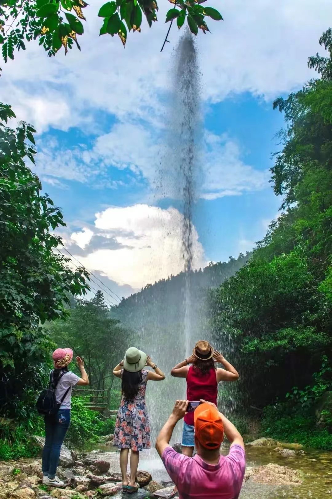 在空气清新的山谷,玩呐喊喷泉,只要一呐喊,谷底的水潭就会喷出巨大的水柱,声音越大,水柱就越高。