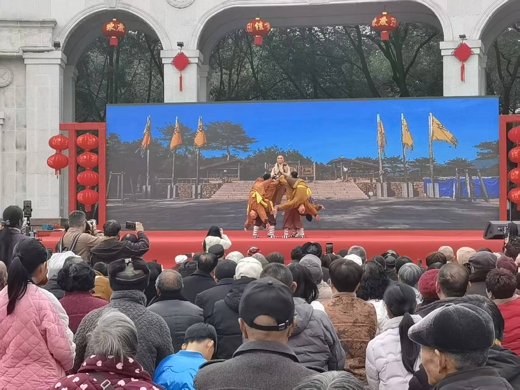 台下,公园广场化身为露天剧场。数百名市民或坐或站,聚精会神地注视着舞台。每当演员完成一个高难度的武打动作或唱出极具穿透力的高腔,人群中便会爆发出热烈的掌声与喝彩声,现场洋溢着欢乐祥和的节日气氛。