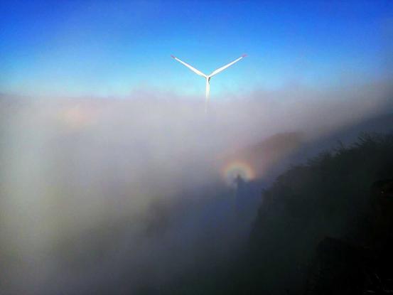 12月6日早上6:30,新化县大熊山国家森林公园蚩尤生态农家乐老板陈杨剑带领游客及摄影爱好者气喘喘地爬上大熊山第二高峰了望台,静等观看雨后天晴的日出。冬天的早晨气温比较低,寒风也好象赶集,呼呼吹送,吹走了雾尘,吹明了大地一片光亮。七时许,东方慢慢呈现一道霞光,太阳冉冉升起,金光四射,彩霞、云海、山峦、风车融为一体,绚丽迷人的日出呈现在眼前。 一小时后,太阳升起来了,气温也升温了,在西边的云层上又出现一道七彩“佛光”奇观:光环内蓝外红,由小变大。在七彩光环中央有个人影,好像“观音菩萨”一样,有趣的是游人走动,发现光环中的人影也在移动。美妙神奇的佛光与山峦、怪石、奇松、风车相映争辉,且持续一个半小时,给游人留下意外惊喜的一幕。笔者询问了当地老农,都说没有见过,实为罕见!