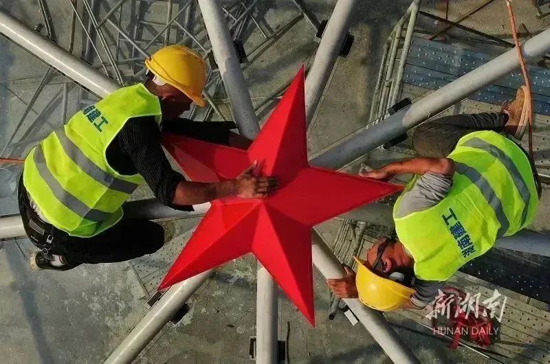 11月7日,韶山市,施工人员在中国红博会“红博园”主展厅球形屋面安装五角星装饰
