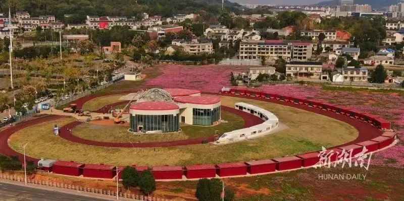 11月23日,韶山游客换乘中心前坪,一座形似花朵、色彩惹眼的建筑给初冬的韶山抹上亮色。这是新建成的韶山“红博园”,11月26日至28日,2022中国红色旅游博览会将在这里举行。