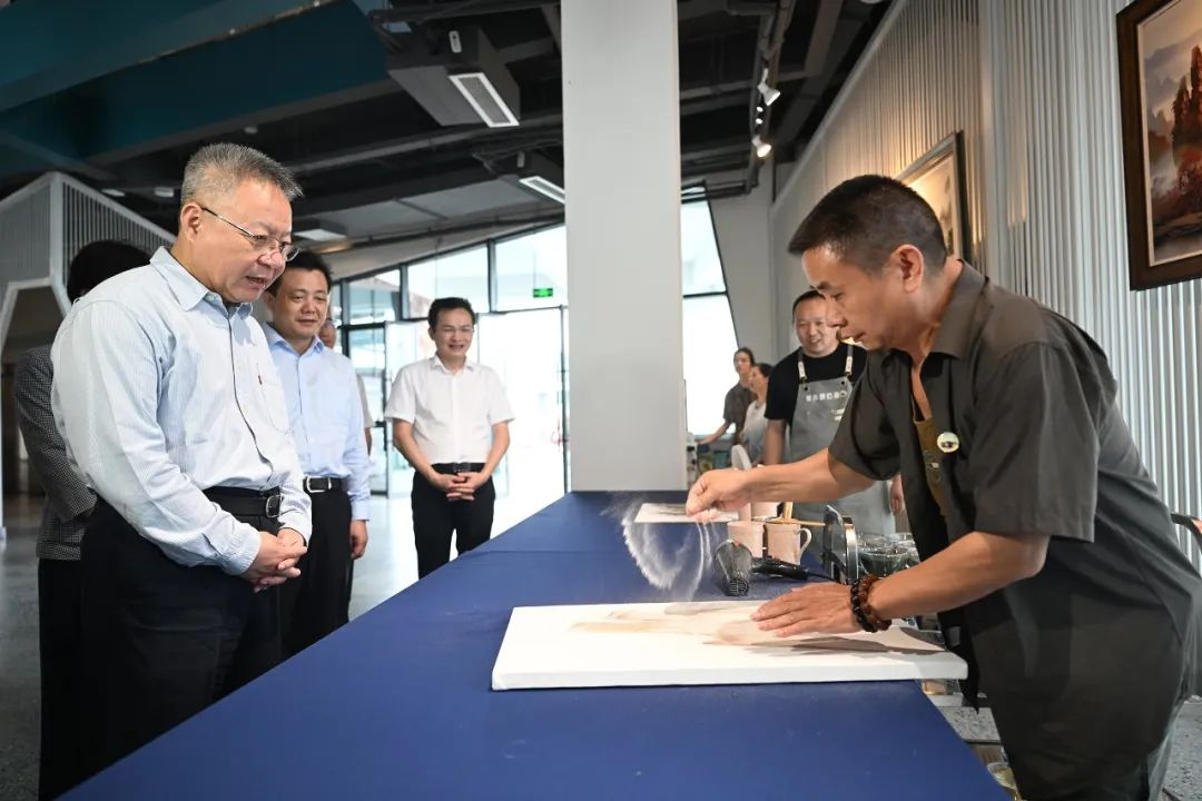 6月21日,沈晓明来到军声砂石画文创园,了解砂石画手工技艺、制作销售、研学旅游产品开发等情况。