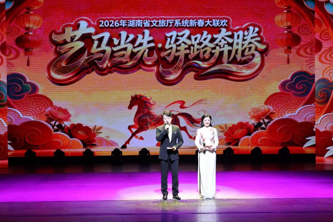 活动以“艺马当先 驿路奔腾”为主题,通过节目展演等形式,系统回顾了过去一年全省文旅业发展成就。2025年,全省文旅系统大力弘扬“三种文化”、答好“两道融合命题”,各项工作取得新进展。事业方面,在第十四届中国艺术节上获文华节目奖1项,文华编剧奖1项、群星奖2项;京剧《皿方罍》、花鼓戏《蔡坤山耕田》等选段亮相国家级重大演出;演艺新空间建设、省博物馆与烈士公园馆园融合、博物馆“省市联动”体系化改革等重点项目稳步推进,“欢乐潇湘”“送戏下乡”“四季村晚”“非遗六进”等惠民活动覆盖三湘四水、惠及千家万户。产业方面,成功举办第四、五届湖南旅发大会,组织“潮起潇湘相约湖南”文旅消费季、“湘超,超好玩”等各类促消费活动3000余场,举办营业性演出5.73万场;推出智慧旅游沉浸式体验新空间等创新案例120余项,开展“跟着徐霞客游湖南”“湘当有味的马王堆”等主题推广活动;持续实施“游客满意在湖南”行动,坚决整治“导游乱象,强制消费”等旅游领域顽瘴痼疾,旅游环境得到进一步优化。全年共接待游客8.19亿人次,实现游客总花费11576.3亿元,同口径比分别增长10.56%、9.02%,其中接待入境游客240.65万人次,游客总花费14.09亿美元,同口径比分别增长19.08%、25.47%。