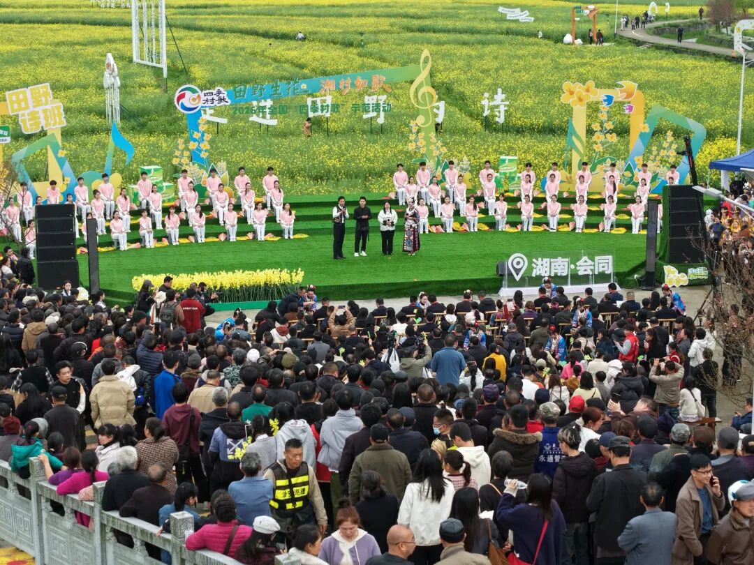 活动打破传统舞台边界,以万亩油菜花海为天然实景舞台,创新采用“行进式观演+主舞台展演”的形式,17个特色节目串联起沉浸式乡村文旅旅程。农耕场景、乡村风貌、诗歌作品自然融入展演全过程,行进观演移步换景、边走边唱,主舞台集中呈现精品节目,整场观演兼具田野气息与仪式感,让观众在听歌赏景的同时感受会同乡村的生态之美、文化之韵。