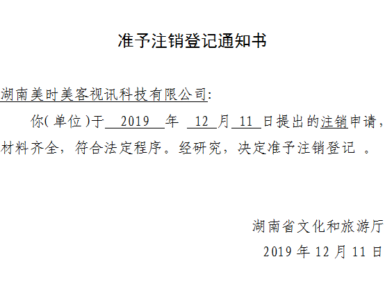 准予注销登记通知书-湖南美时美客视讯科技有限公司