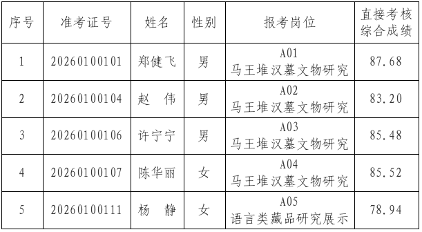 根据《湖南博物院(湖南省文物鉴定中心)2025年高层次人才公开招聘公告》(机构更名前发布)要求,经网上报名、资格审查、直接考核等规定程序,按应聘同一岗位综合成绩排名先后,确定5名人员入围体检和考察环节(名单详见下表)。请入围人员保持通讯畅通,具体事宜将另行通知。