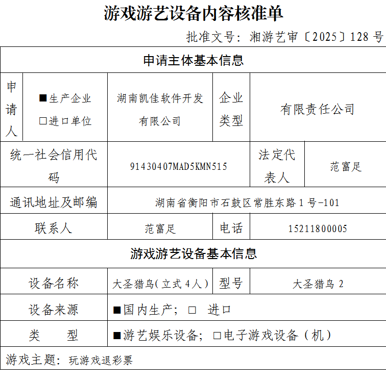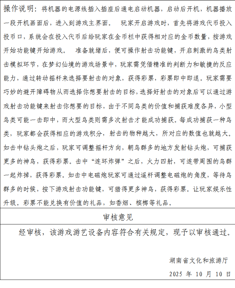游戏游艺设备内容核准单-批准文号:湘游艺审〔2025〕128号