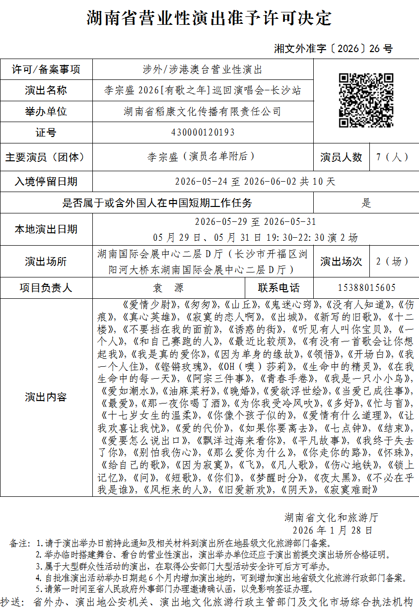 湖南省营业性演出准予许可决定-湘文外准字〔2026〕26号