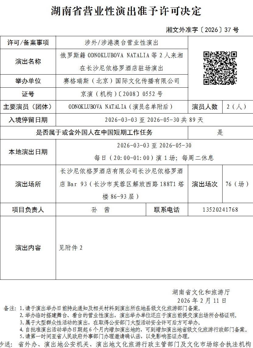 湖南省营业性演出准予许可决定-湘文外准字〔2026〕37号